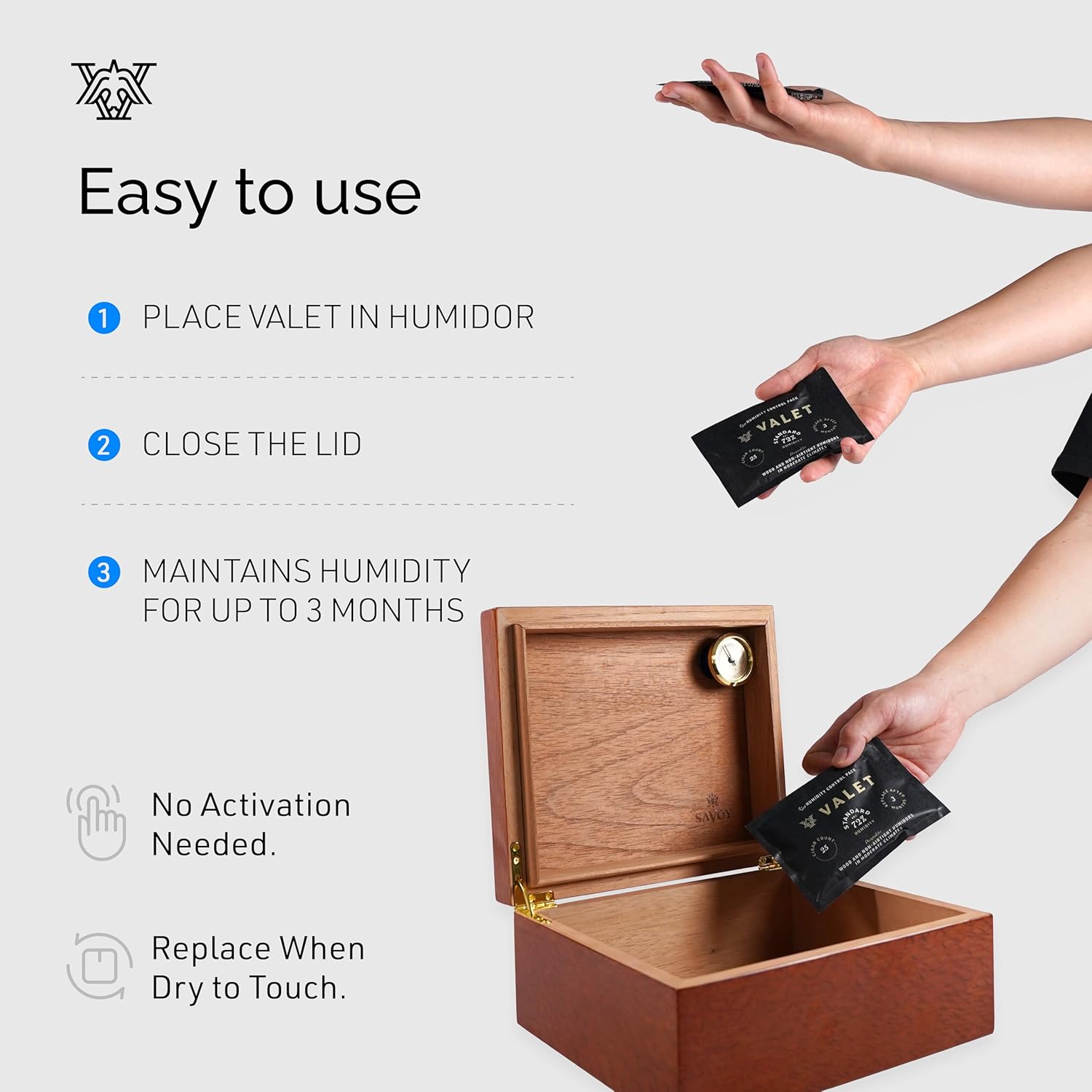 Keep your cigars fresh. No more gels, sponges, beads, or confusing charts. Just use select the pack designed for your environment and use 1 for every 25 cigars your humidor or container can hold. Replace after 3 months or whenever when pack starts to feel dry. No activation required.